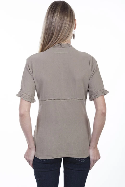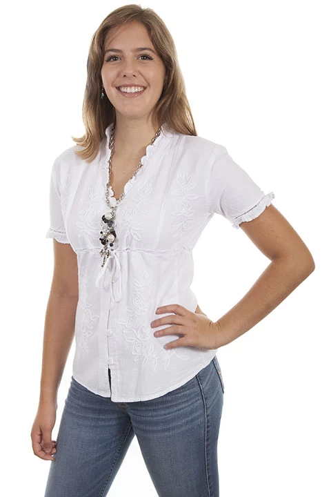 This 100% Peruvian cotton blouse features a button front with loops. Empire style with crochet panel and soutashe throughout. Ruffled neckline and sleeves. Machine wash cold and hang dry.