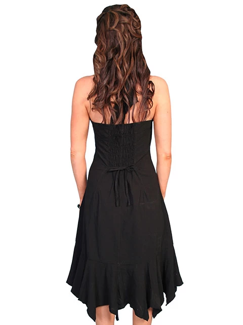 100% peruvian cotton ruffled halter dress. Asymmetrical hemline falls below the knee. Machine wash cold and hang dry.