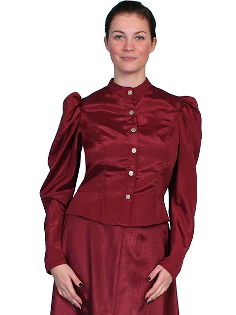 This classic 1880’s style blouse features large puff sleeves indicative of the era. Beautiful buttons embellish the front and cuffs and a back tie for the perfect fit. It’s made of a elegant moire fabric great for special occasions. Pair with matching skirt for a gorgeous outfit. 64% cotton 36% polyester. Made in usa.