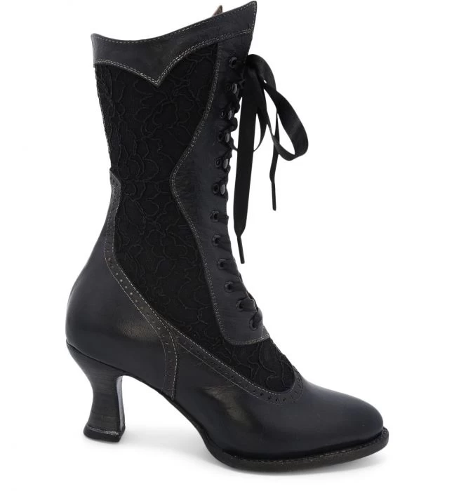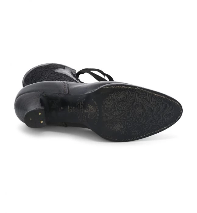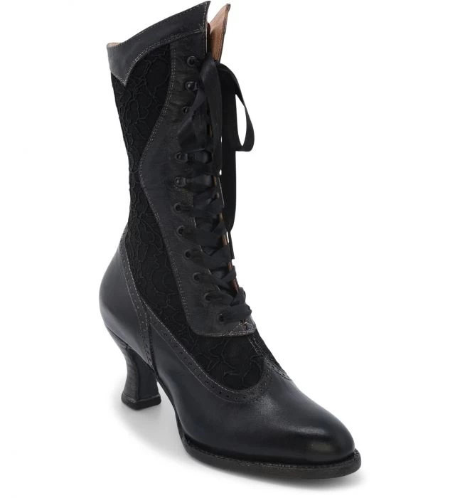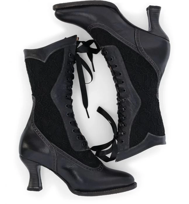 A beautifully hand crafted leather boot with charming details ABIGALE. Hand dyed black rustic with delicate black lace inlays, pinking detail, and satin laces this style will have you turning heads. Feminine and romantic details make Abigale a must have for your boot collection.