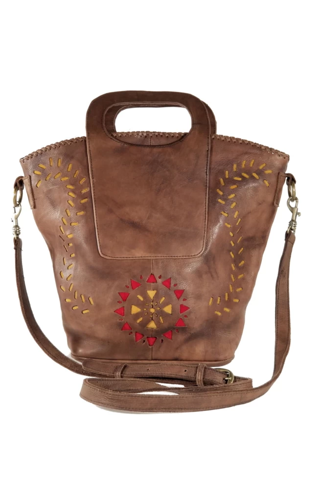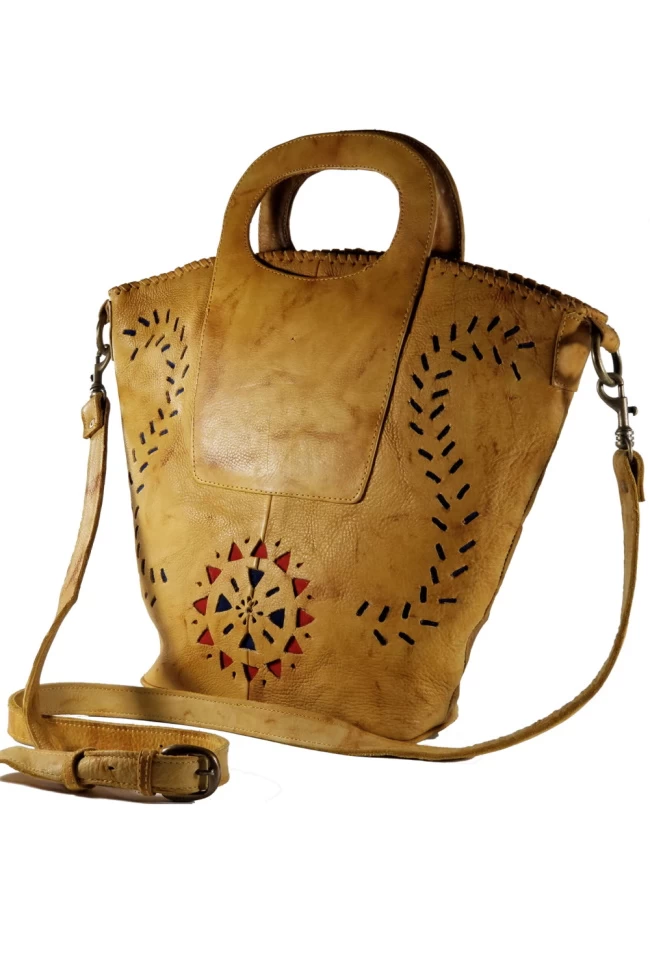 This beaitiful handcrafted leather Amarillo bucket style shoulder and cross body bag features a cloth lining made in a very soft cowhide with cut out patterns. The Amarillo bucket bag features a zip closure on top and has a zipper pocket inside. It has handles which can hold cell phones, reading/sun glasses in these pockets on each side.Comes with the detachable shoulder strap to wear as a cross body bag. It is available in Black,Tan & Brown. The Dimensions of this bucket style bag are 12″ H, 13″W on top, 4″ D.
