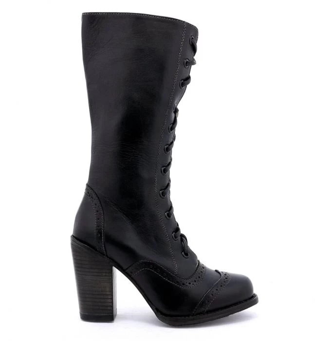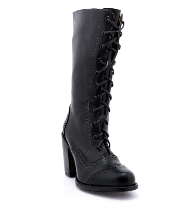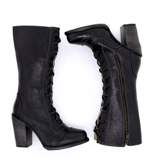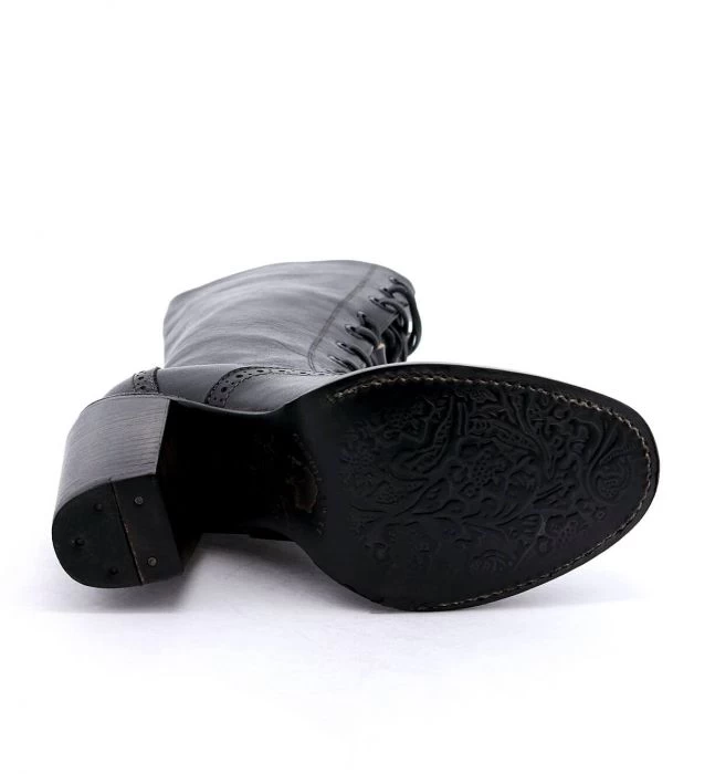 Created for the statuesque female ARIANA. A tall leather boot with hand tooled pinking detail, wing tip toe, front lace and back zipper this pair will have you feeling elegant and regal. Slip on our hand dyed Black Rustic color of the Ariana and venture out with confidence.