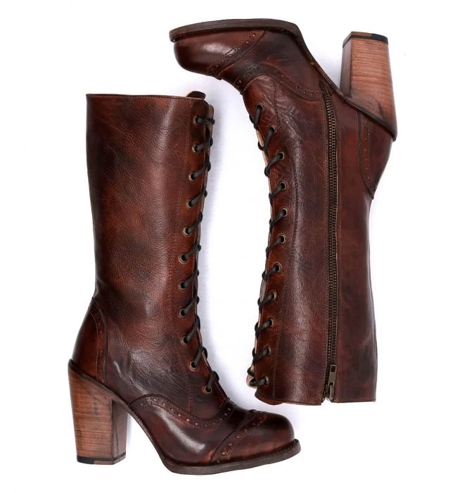 Sophisticated and beautiful ARIANA. A tall Victorian leather boot with an 11 eyelet lace up shaft, decorative broguing detail. Hand dyed Teak Rustic, with a leather wrapped heel and re-soleable Good year welt leather outsole. Make a powerful statement in Ariana.