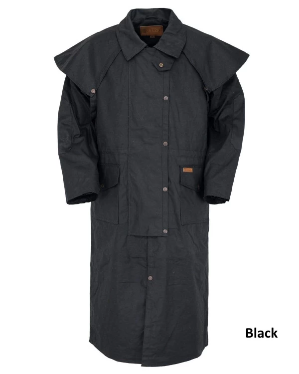This Outback Trading Company extra long Australian Stockman Oilskin Duster helps keep you dry and warm in all weather due to the many features and premium materials in this unique oilskin slicker.