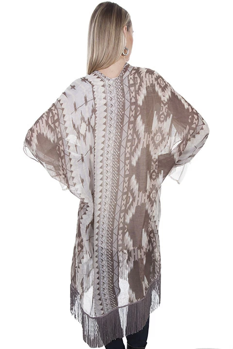 This slenderizing kimono features an Aztec inspired pattern with generous fringe around the hemline. Luxuriously soft and draped, the sheer poly fabric gives it a whimsical look. 100% polyester. Machine wash cold and hang dry.