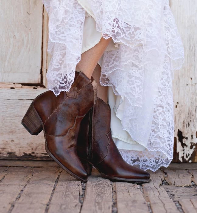 Vintage and contemporary blend perfectly in BAILA. A country inspired leather ankle boot made in an eye-catching Teak Rustic color. Experience true craftsmanship in this pointed toe beauty. Featuring scalloped leather detail, a leather wrapped heel and cushioned foot bed. Make Baila part of your western boot collection.