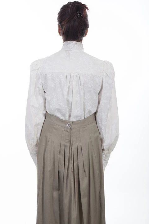 Band collar full button front blouse. This le fleur pattern is well known in new orleans canada and france. This 1880’s style features shirred shoulder sleeves and three pleated panels on each front shoulder. 100% cotton. Made in usa.