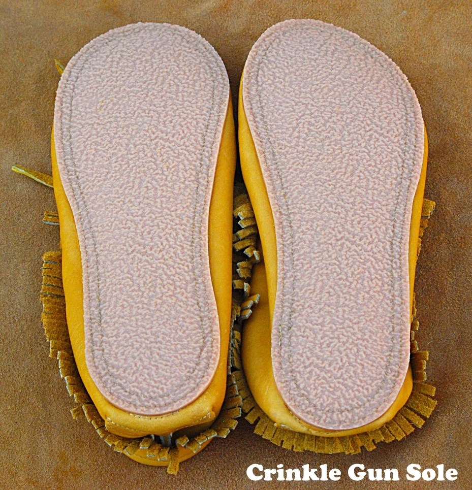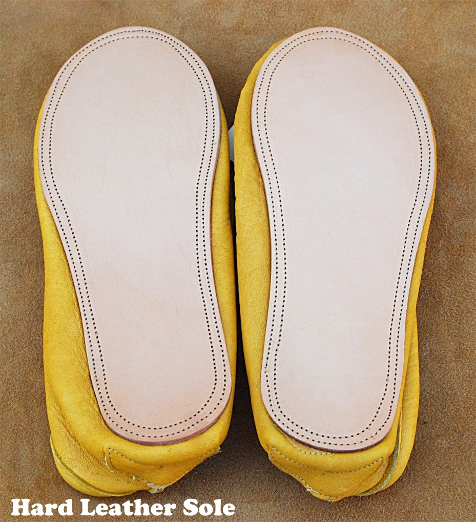 The leather used in these moccasins comes exclusively from ranch raised American Bison. The Bison leather selected for moccasins is soft, yet strong, tough and wears well. Bison leather has a very distinctive grain and texture.