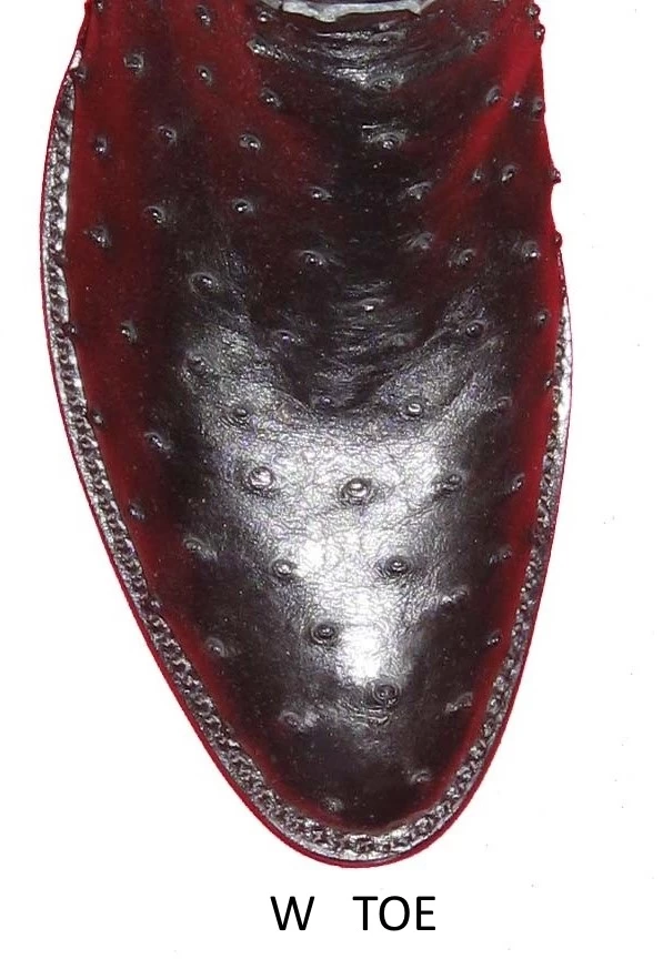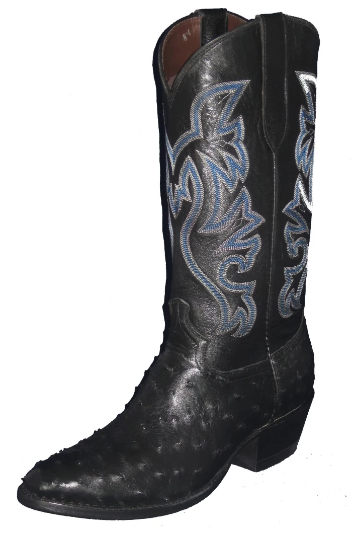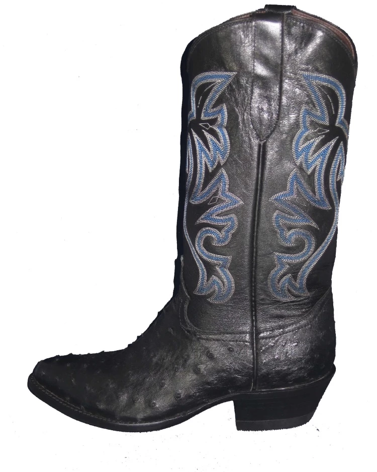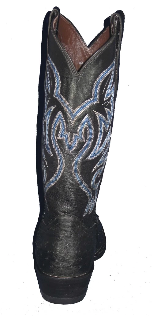 Men’s Ostrich Cowboy Boots Model 96 Black Full Quill Ostrich Cowboy Boots from the Old Trading Post Boot Corral. These Black Full Quill Ostrich Cowboy Boots are Handmade in El Paso Texas and are made with a 13″ leather top shaft with fancy stitching, they are leather lined, and come with leather soles also a 1 3/4″ walking heel. Ostrich is the softest and easiest leather to break in, yet wears surprisingly well over the years.