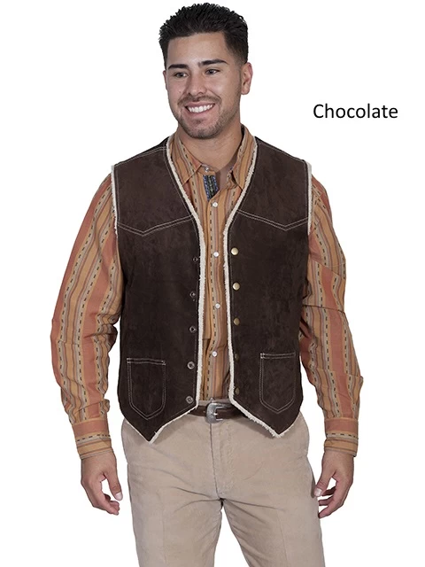 Boar suede hunting vest with faux shearling lining. Easy-on easy-off snap closures on front. Two outside patch pockets.