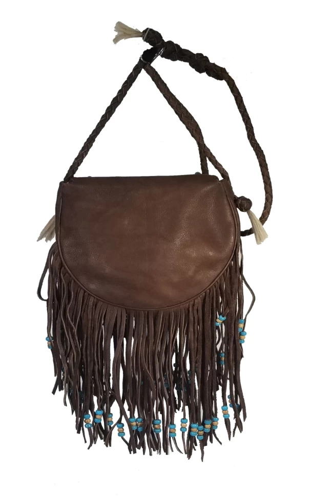The Rossette Leather Shoulder Bag is made from a soft full top grain leather accented with bone pipes and glass beads. Fashioned in a Native American antique looking design with hand cut fringe, beautiful glass bead work, combined with horse hair trim in the center. The leather shoulder strap is braided and adjustable with hand knotted trim. The ends of the shoulder strap have horse hair trim on all the ends. The flap of the bag is trimmed with hand lacing. Available in your choice of 3 colors Black, Brown and Tan. The dimensions of this Rossette bag are 7.5″ H X 8″ W X 2″ D.