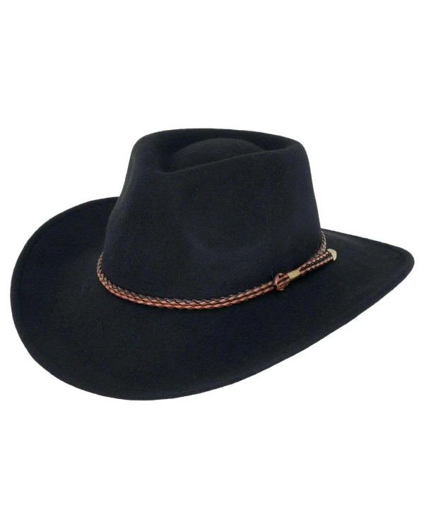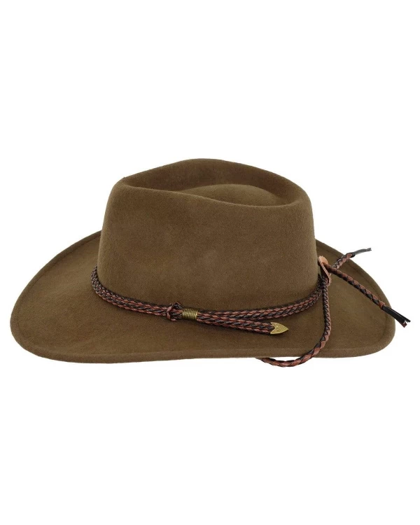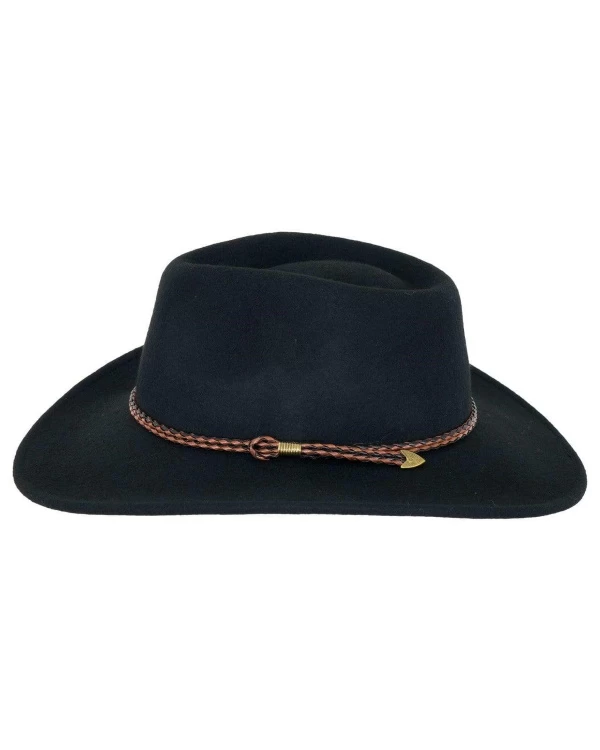 The Broken Hill is made from 100% Australian wool with a UPF rating of 50 and completed with a band of woven black and brown leather with matching chin cord.