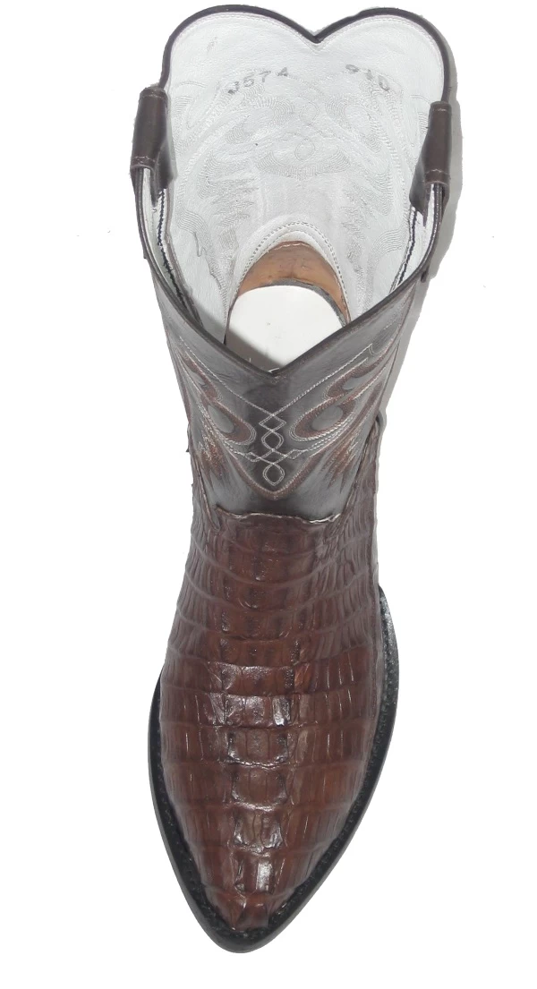 These Brown Crocodile Cowboy Boots are made with a 13″ Medium Brown Leather Top Shaft with Fancy Stitching, they are Leather Lined with Leather Insoles and Outer Soles. We also offer these Brown Crocodile Cowboy Boots with either a J Toe (Round Pointed) or W Toe (Full Round) with 1 3/4 Inch Western Walking Heels. A quality boot at a great price !