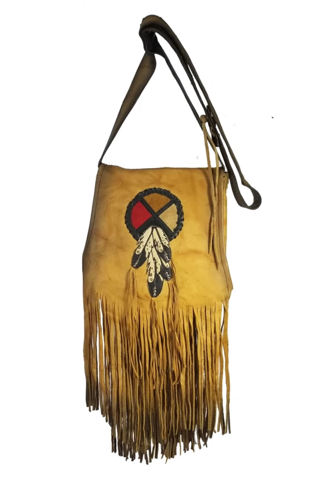 This shoulder bag is made in a very soft full top grain leather featuring a Native American & feather hand painted Circle Of Life motif, has a wide cross body adjustable shoulder strap and leather fringes on the front and back. There are also two pockets inside and one pocket on the back of the bag. Dark finished edges give this shoulder bag an old antique look. with antique finishes. The dimensions of this shoulder bag are 9″ H X 9″ W X 2″ D. Available in 3 leather colors Black, Brown and Tan.
