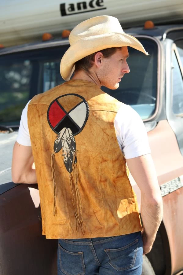 This vest is made from butter soft Cowhide leather with the Western Indian Circle of life motif at the back and applique work on lapels. This handsome vest is made with tie down front with Conchos and two front side pockets. We offer these vests in Brown or Tan Cowhide Leather Colors for a variety to suit your personal preference.