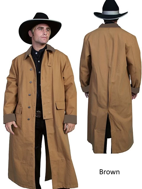 Classic authentic canvas duster with corduroy collar and cuffs. It also features metal buttons saddle gusset and inside leg straps for bad weather riding. Made as the same heavy canvas duckin’ as our frontier pants. 100% cotton canvas. Unlined. Import.