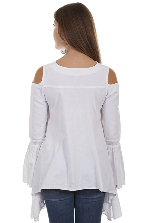 This summery soft cotton tunic features a flowing hi/lo style. The bib front has a front tie with tassels and the lower front is pleated to give free range draping. The sleeves feature cold shoulder openings, long ruffled cuffs with a crochet inset band. 100% cotton. Machine wash cold and hang dry.