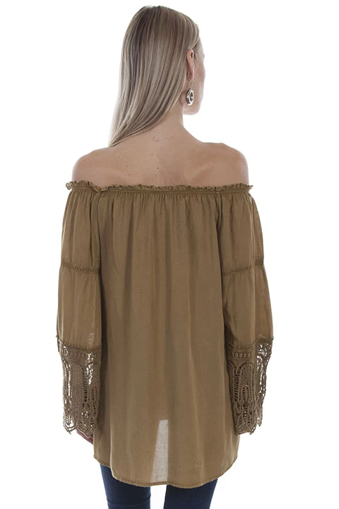 This simple elegant off the shoulders blouse is reinvented with a delicate crochet pattern on the cuffs. 100% viscose. Hand wash cold or dry clean.
