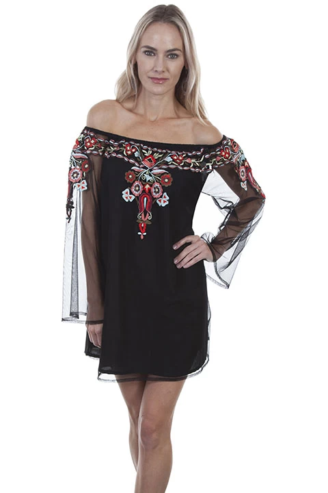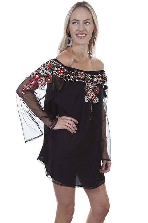 This Embroidered blouse with sheer sleeves has style which renders a distinct fashion statement incorporating this vibrant colored folk-like theme embroidery on the front and over the sheer sleeves. This pullover style features a wide scoop neck with sheer bell sleeves. Hand wash separately in cold water or dry clean.
