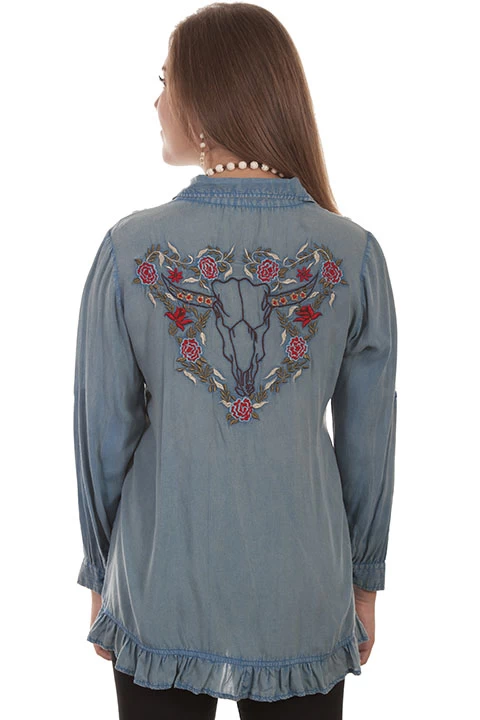 Unwind in this classic empire style tunic.This 100% viscose fabric flows and drapes to flatter your figure. The front bodice is abundantly embroidered in a delightful floral pattern. The back is enhanced with an embroidered longhorn and floral vine pattern. It features a full button front, point collar, long sleeves and ruffled hem. Hand wash cold separately or dry clean recommended.