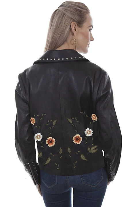 This spirited floral embroidery adds a layer of springtime glory on this classic leather motorcycle jacket. This exquisite leather jacket features an asymmetric front zip closure with nickel studs on notched lapels. The studs run down the zip front, on the two lower side entry pockets and on either side of the zip cuff closures. Lined.