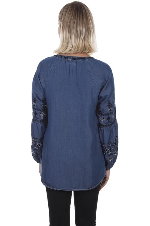 This Embroidered split neck blouse with relaxed fit is great for lounging! It features a split neck with a ribbon band extending down the center front. Beautiful sleeves in a floral folk-like pattern. Machine wash cold with like colors only non chlorine bleach when needed line dry warm iron if needed.