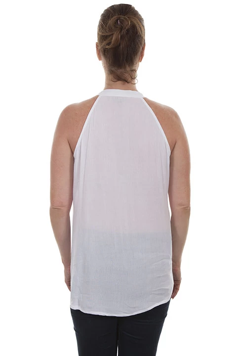 This easy-fit beachy “rick rack” tank features an embroidery that has a folklore theme with two vertical center bands. This racer tank style has a long front tie with tassels. 100% viscose – hand wash cold water.