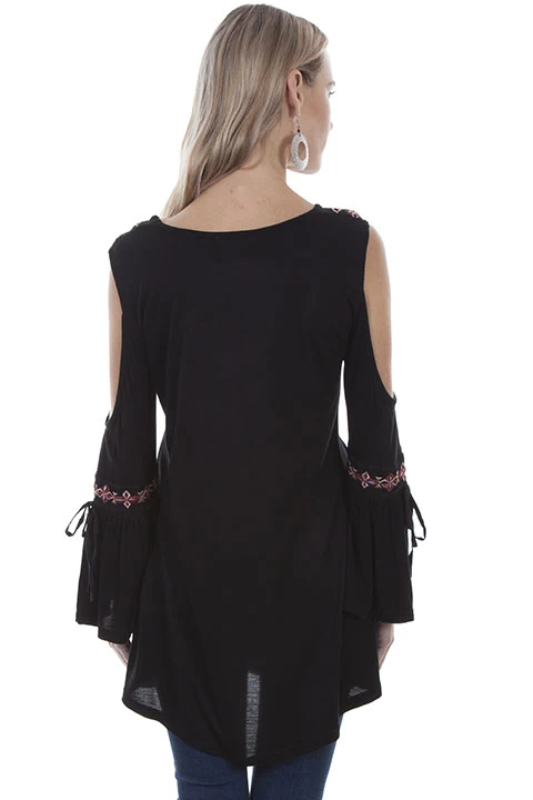 Subtle abstract bands of embroidery embellish the scoop neck area and sleeves on a mesh fabric. The exaggerated bell sleeves and overstated peek-a-boo shoulder opening gives this style an edgy look. Great look for evenings out. Hand wash separately in cold water. Dry clean recommended. 100% viscose.