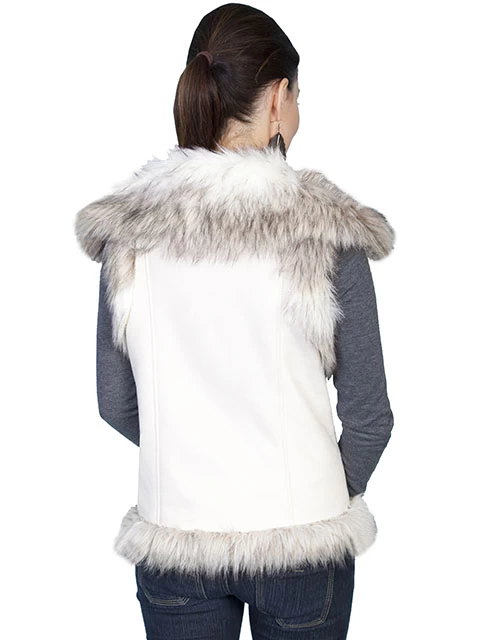 Fashionable faux fur vest.. Features generous faux fur on shoulders down the front and all around the bottom. It has two side entry pockets and hook and eye closure.. Lined with faux fur that is 100% acrylic. Body is a faux suede made of 100% polyester. Dry clean only.