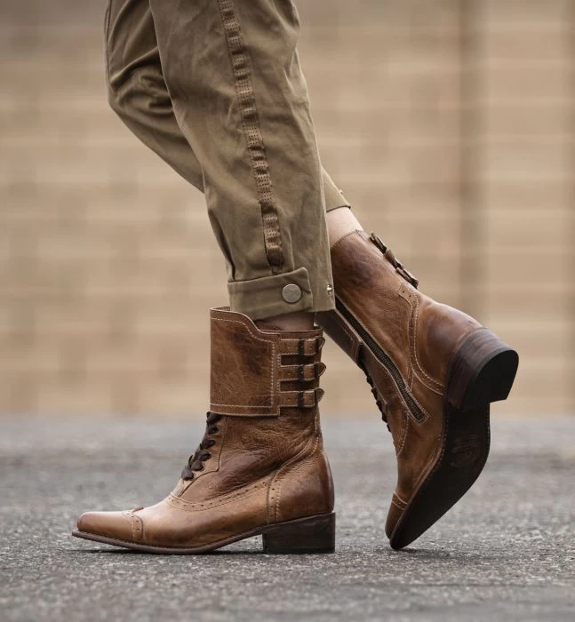A perfect blend of beauty and craftsmanship, FAYE. A one of a kind handcrafted tan leather boot with a leather lace panel, satin laces, pinking detail, and a pointed toe. This riding boot was constructed with beauty and utility in mind.