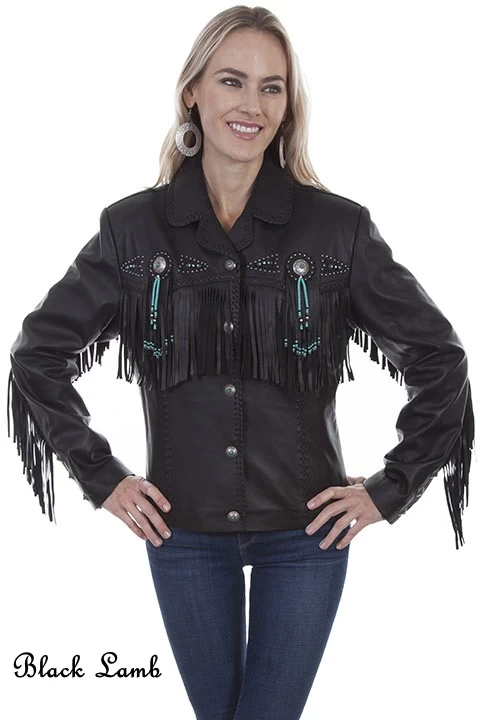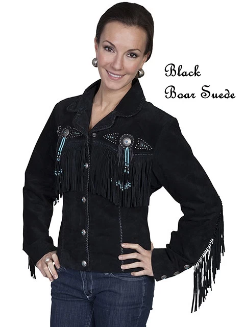 Boar suede fringe and beaded jacket. This classic western jacket has a flattering fit. It features fringe yokes front and back and down the sleeves. This western design features conchos with beaded fringe and stud and bead design detail. Lined.
