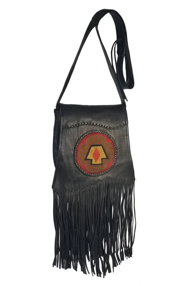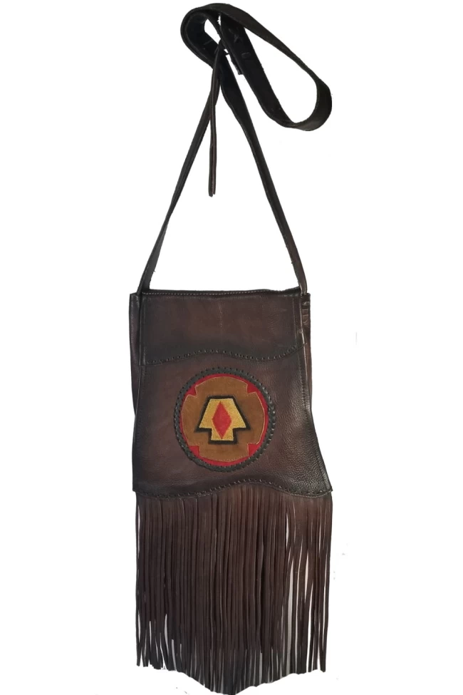 The Medicine Bag is made in a soft full top grain leather with applique work of native american motif, lacing adorned with fringes on front and back. The bag has two pockets inside and one pocket on back side for phone or glasses. It has a wide shoulder strap and is adjustable cross body. The edges are dark finished to give an old west antique look. the dimensions of this bag are 9″ H X 9″ W X 2″ D. The Medicine Bag is available in 3 leather colors Black Brown or Tan.