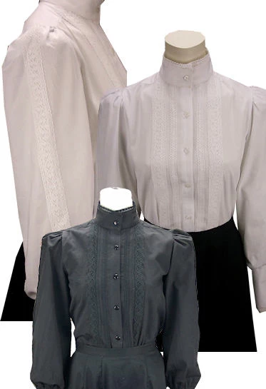 A simple yet elegant ladies old west frontier style blouse. Highlighted by a vertical strip of lace on each size of the buttons and the sleeves. Available in sizes Small through 2X-Large and in either black, natural or white colors.