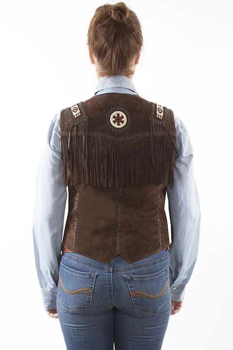 This exquisite western vest features beaded trim epaulets on shoulders and beaded circle on the back. It has lace trim throughout. The front and back yokes have a buck stitch trim and fringe. The interior is lined.