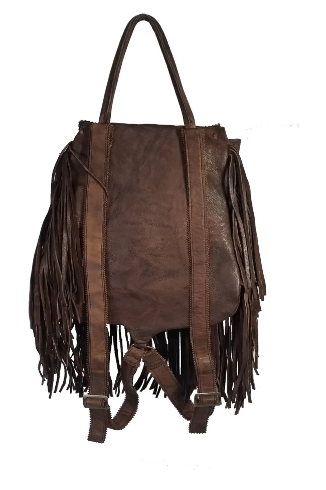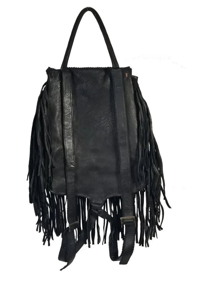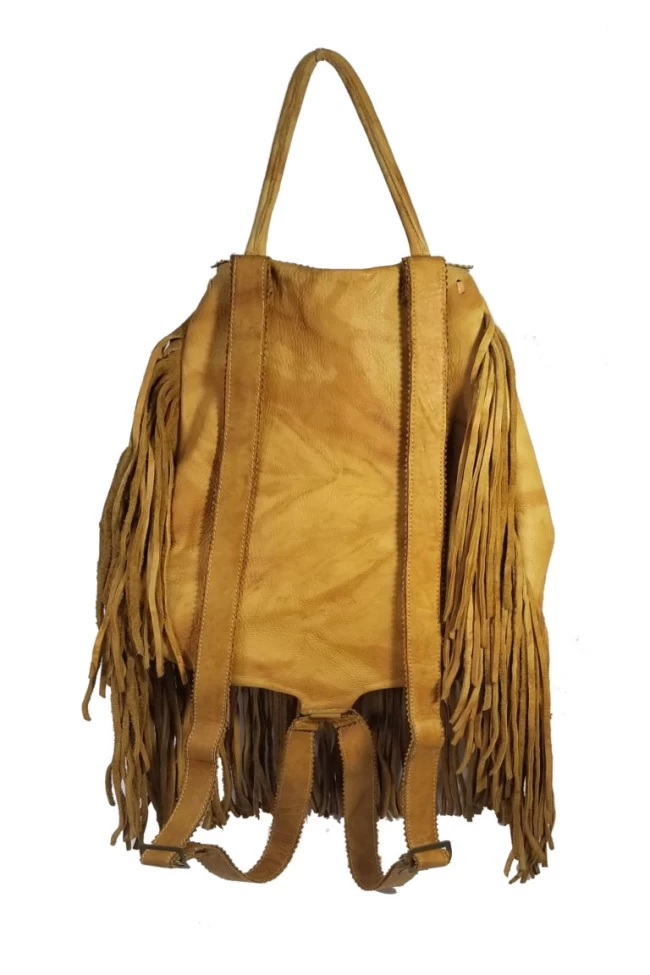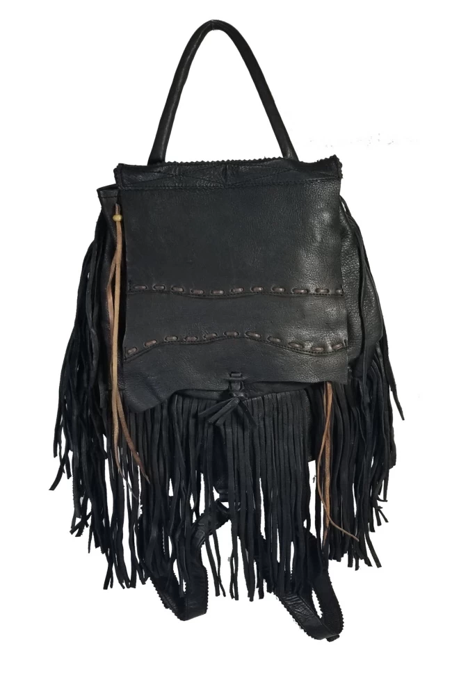 The Rucksack Backpack is made of a soft full top grain leather and trimmed with hand cut fringes and a hand laced front flap. This backpack has a knotted closure with a braided loop that features an adjustable shoulder strap and leather clutch handle on top of the backpack. It also has a zip pocket inside. Available in your choice of 3 colors Black, Brown, or Tan. There are closure strings on top sides with a bone bead to adjust. The dimensions of this Rucksack backpack are 10″H X 8″ W on top & 10″ W at base X 4.5″ D.