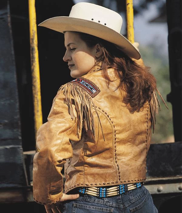 The ladies Yavapai short style western jacket has hand woven bead work on each shoulder and is made of a very soft top quality cowhide leather. Available in the Tan color leather only this beautiful ladies leather jacket has hand lacing on all seams and also features an open front with bone buttons and leather ties on both sides. It comes fully lined with a poly satin lining and comes with one inner lining pocket.