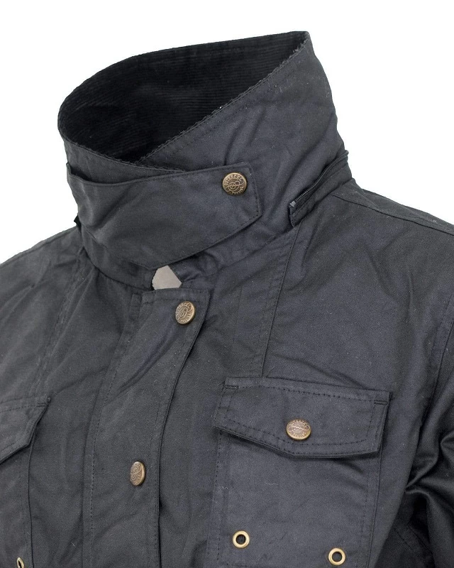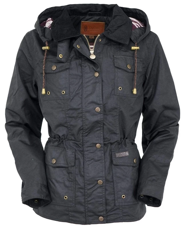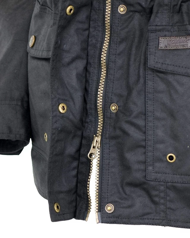 This is the edgiest Oilskin ladies jacket Outback Trading Company offers, the Jill-a-Roo, has a corduroy collar, drawstring waist and adjustable cuffs and riding gussets.