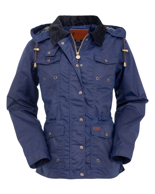 This is the edgiest Oilskin ladies jacket Outback Trading Company offers, the Jill-a-Roo, has a corduroy collar, drawstring waist and adjustable cuffs and riding gussets.