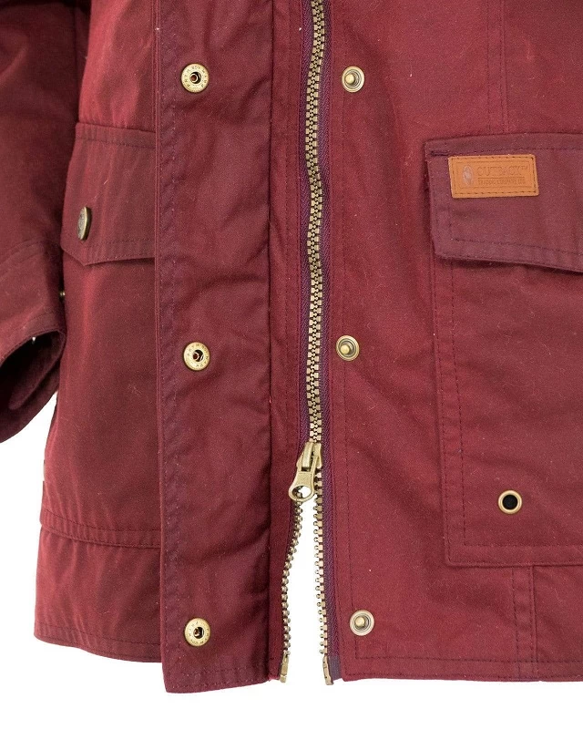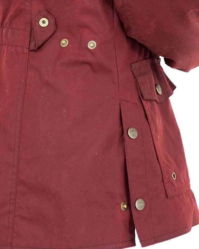This is the edgiest Oilskin ladies jacket Outback Trading Company offers, the Jill-a-Roo, has a corduroy collar, drawstring waist and adjustable cuffs and riding gussets.
