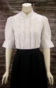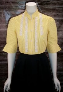 Beautiful ladies western frontier style Karen blouse features a stand up collar and short sleeves the blouse is embellished with four rows of lace ruffles down the front and has a front button closure. Made of 100% cotton. Available in Burgundy Print, Yellow Stripe, Black, or White. Comes in sizes X-Small through 2X-Large.