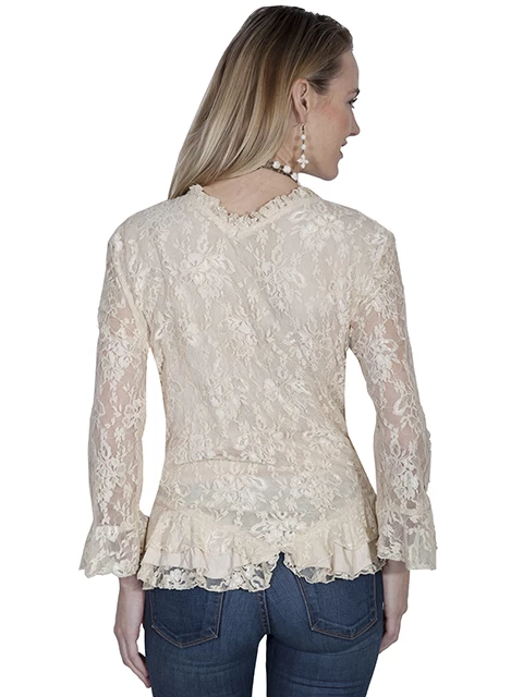 Lace top. Lace-up front tie. 3/4 sleeves with ruffle edge. Ruffles run down either side of front lace-up tie. Two side panels with lace and ruffles run down front. 60% polyester and 40% cotton. Hand wash cold and hang dry. Import.