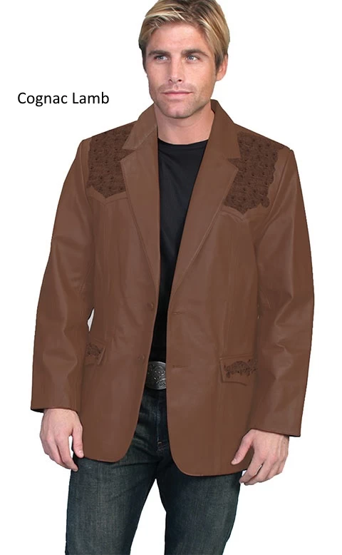 Lambskin blazer with genuine ostrich trim. Ostrich trim on yokes and front flap pockets. Two button front. Center back vent. Two inside pockets with buttons. Acetate lining.