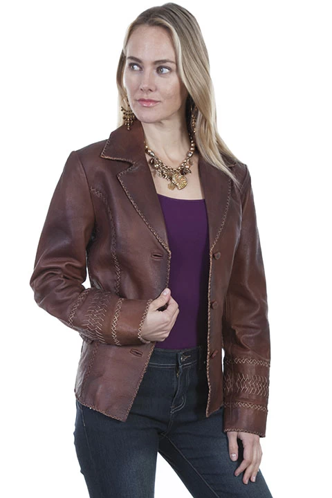 This jacket features a three button closure with whip stitch trim on notched lapels, down the front and around the bottom. The back and sleeves have cross stitch seams. Detailed stitch design on cuffs. Two lower flap pockets with cross stitch design. Lined.