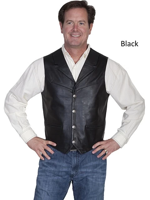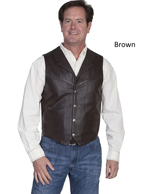 This Lambskin lapel vest has single point yokes front & back. 4-snap front closure. Two front welt pockets. One inside pocket. Collar Lapels. Acetate lining.