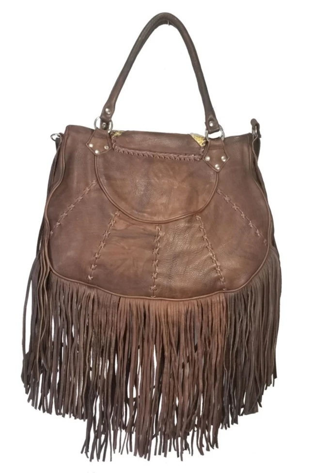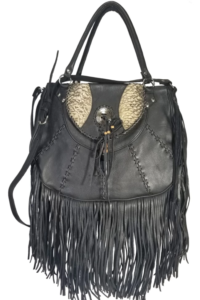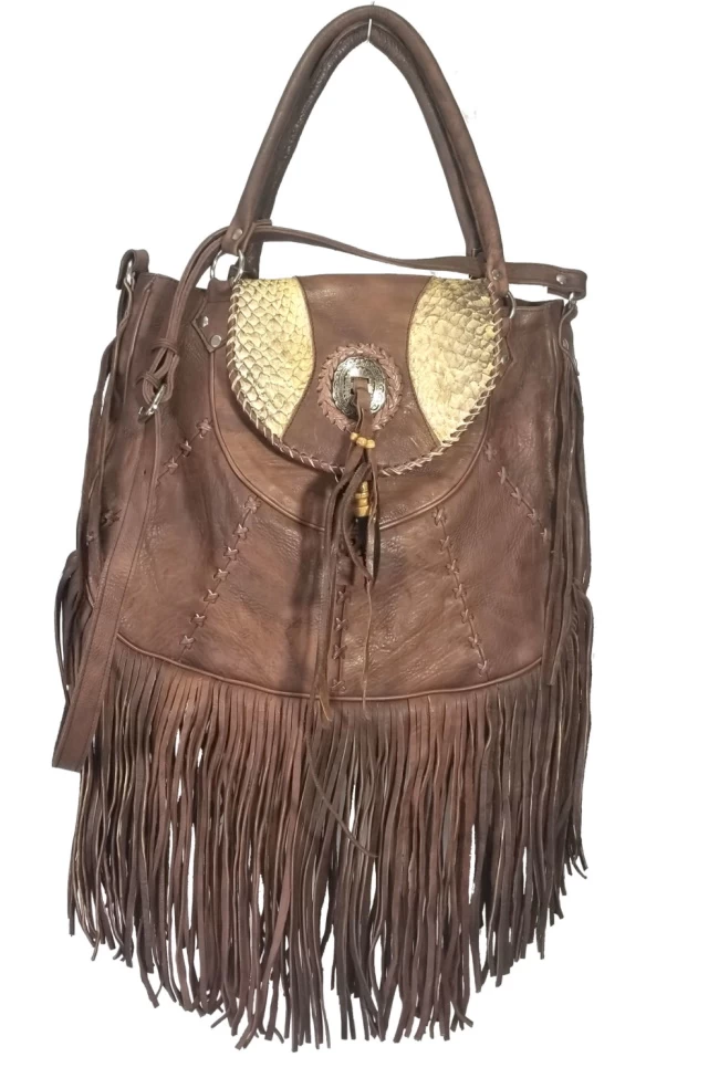 Our large size leather bag is the perfect bag for toting your notebook ipad or small laptop. Featuring unique fish skin embellishments, a magnetic button closure, and comes fully lined with a zip pocket inside. The bag can be used as an office bag as well. It has hand cross lacing in front and back and an adjustable cross body strap as well as handles to clutch the bag for easy transport. Adorned with a concho on the front with leather fringe bone beads attached to it. Comes in your choice of 2 leather colors Black or Brown. The dimensions of this bag are 12″ H X 15″ W X 2″ D.