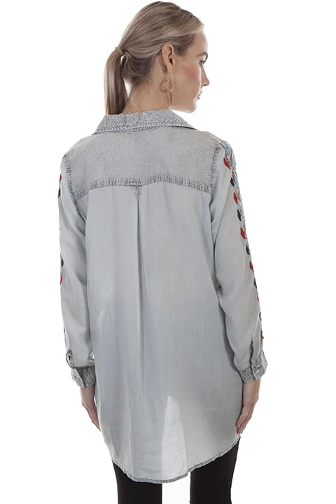 This Light and summery 100% viscose blouse is an airy blouse which features a geometric colorful floral embroidery on the front, sleeves and around the hemline. This soft light blue blouse is a button front closure with point collar and long sleeves. Hand wash cool and hang dry. 100% viscose.