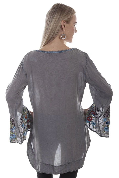 This hi/lo lace-up front tunic features large flared bell sleeves with a vivid colored floral embroidery with an open slit. An embroidered band highlights the collar and front lacing area. Hand wash separately in cold water or dry clean. 100% viscose.