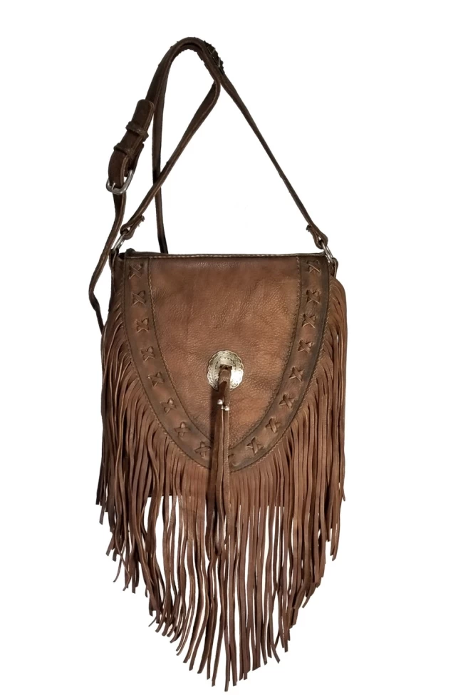 The Lubbock leather shoulder or cross body bag is a full top grain leather bag designed in a spear head shape features with a brass concho, fringe, and also has cross hand lacing on the front flap in same color. The bag is fully lined with an inside zip pocket. The edges of this bag are darkened to give the bag an antique finish. There is an adjustable shoulder strap. The bag can also be used as a cross body bag. Available in your choice of 4 different leather colors Cream, Black, Brown and Tan color. The dimensions of this leather bag are 10.5″ H X 9″ W X 2.25″ D without fringes.