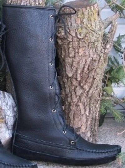 These Knee High Moccasins Boots from Footskins are handcrafted of deertan leather for a conforming fit. The foot portion is also leather lined, completely surrounding your foot with smooth leather. Between the leather layers there are both a leather insole and a Poron cushion insole. Outside, there is a durable canoe sole of thick cowhide for added wear and toughness.