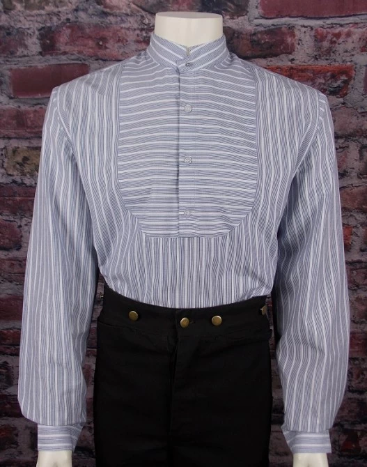 | This handsome mens 1800’s old west frontier style pullover stripe shirt has a contrast inset bib, sports a small standup collar; has a tab on the back to hold a tie in place and has gathered at the center back yoke for extra comfort. 100% cotton. Available in sizes ranging from Small-3XL. Comes in a burgundy or navy blue stripe pattern. |